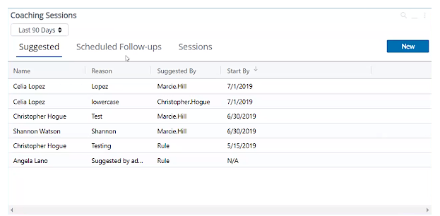 This module allows coaches or admins to create a new coaching session, view a list of suggested sessions, a list of sessions that need follow, and a history of all coaching sessions within the given time range. To create a new coaching session from the module, click New, then follow the normal process for creating a coaching session.